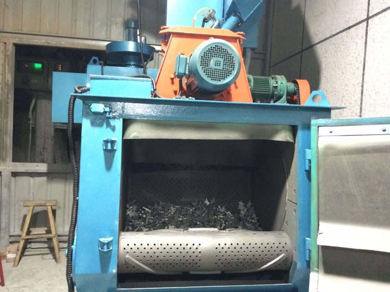 工作原理:在清理室中加入規定數量的工件,機器啟動后,拋丸器高速拋出的彈丸形成流丸束,均勻地打擊在工件表面上,從而達到清理、強化的目的。拋出的彈丸及砂粒,流入提升機內,由提升機提升到分離器中進行分離。粉塵由風機吸送到除塵器中過濾,清潔空氣排入大氣中,布袋上的灰塵經機械振打落入除塵器底部的集塵箱中,用戶可定期清除,廢砂由廢料管流出,用戶可回用。丸砂混合物由回用管收回進入室體,待分離器分離后再回用,干凈的彈丸由電磁供丸閘門進入拋丸器拋打工件。